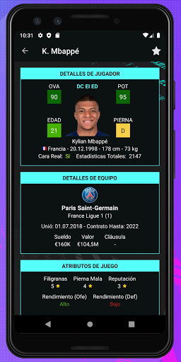 Busca jugadores fácilmente por su Valoración General, Potencial, Cara Real, Pierna, Atributos De Juego, Posición, Nacionalidad, Liga, Equipo, Contrato y Técnica. Analiza los jugadores detalladamente. Player Potentials 21 es super fácil de usar. Esta aplicación complementaria será tu mejor guía en los mercados de fichajes.