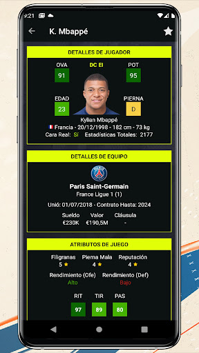 En la pantalla de Detalles de Jugador, eres capaz de mostrar datos muy detallados como Foto del Jugador, Nombre Completo, Posiciones Preferidas, Fecha de Nacimiento, Altura, Peso, Fecha de Expiración de Contrato, Sueldo, Valor, Cláusula de Rescisión, Especialidades, Rasgos, Pierna Mala, Filigranas, Rendimientos y Clasificación de Jugadores Por Posiciones.