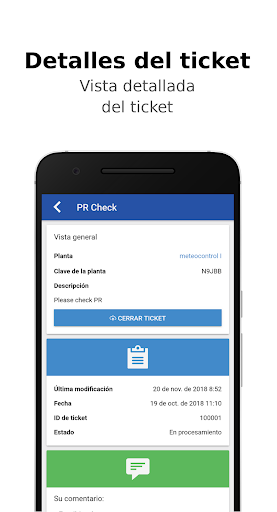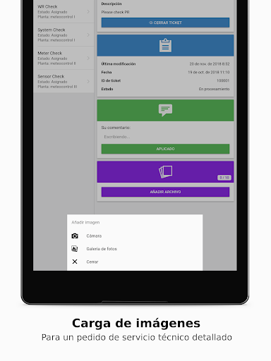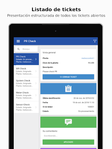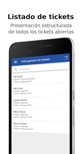 La app O&M de VCOM le permitirá ver y procesar los tickets de VCOM que se le asignen, independientemente de dónde se encuentre. Puede documentar las actuaciones sobre el terreno cargando comentarios e imágenes. Al finalizar la intervención toda la información se transmite al VCOM. La app permite tener siempre acceso a los datos más importantes de las plantas, como la ubicación y los datos de contacto. Para poder utilizar la app deberá haberse registrado en VCOM y utilizar el sistema de tickets.