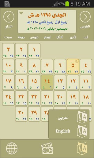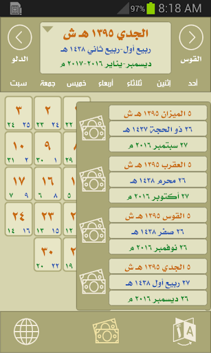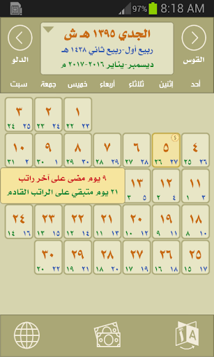 - حساب كم مضى على تاريخ آخر راتب لموظفي الدولة في السعودية وكم تبقى على الراتب القادم وذلك من خلال الضغط على اليوم الخامس من كل شهر هجري شمسي والذي تم تمييزه باللون الأصفر وعلامة أو رمز العملة