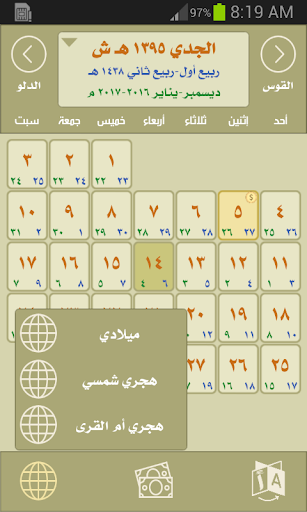 التطبيق يحتوي على التقويم الهجري الشمسي إضافة إلى التقويم الهجري أم القرى والتقويم الميلادي بالنسبة للتقويم الشمسي وتقويم أم القرى فتحتوي على تقويم السنة الحالية حيث لابد من تحديث التطبيق بشكل سنوي لكي يتم تحديث التقويم للسنة الجديدة