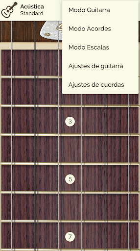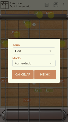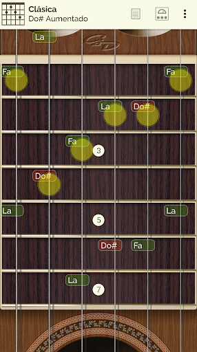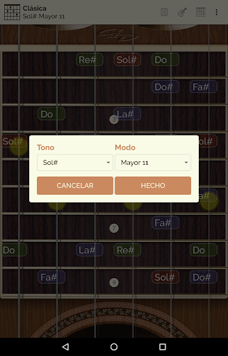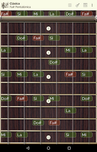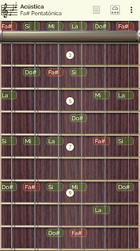 Puedes ver y escuchar 24 tipos de escalas y 18 tipos de acordes a lo largo de todo el mástil y mostrar en pantalla la información de la nota pulsada.