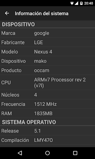 Además muestra información del sistema como propiedades de la CPU, RAM, almacenamiento, versión del kernel, pantalla...