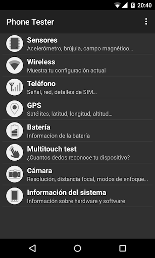 Esta aplicación te permite comprobar el correcto funcionamiento de distintos elementos de tu dispositivo (teléfono o tablet). Podrás probar lo siguiente: