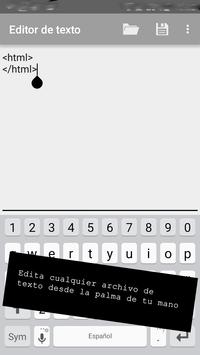 Todo archivo que contiene texto puede ser editado con esta app. Los archivos de texto son txt, html, php, js, css, sql, java, xml y muchos más.