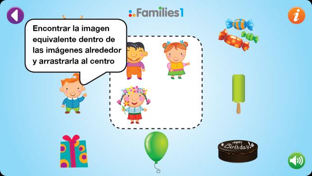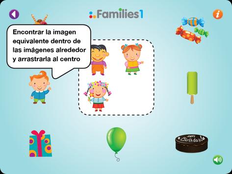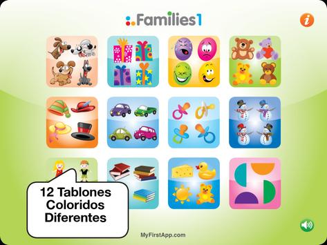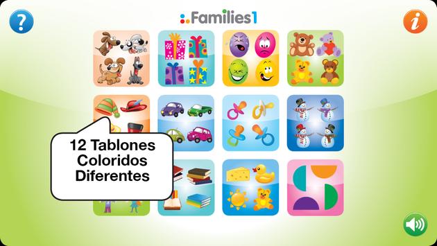 En Familias 1, las familias están compuestas por 4 imágenes semejantes con una variación visual leve. Está diseñado para niños con 2 años de edad o mayores.