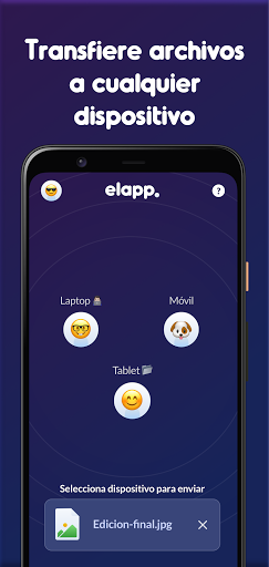 Elapp te permite enviar archivos a moviles y computadoras cerca tuyo. Envia fotos y videos a amigos alrededor tuyo super rapido sin perder calidad.