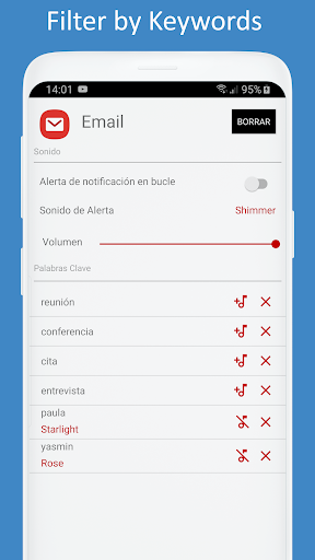 => Una alerta va a sonar cuando una notificación de esa aplicación contiene la palabra clave elegida.