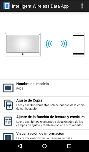 Intelligent Wireless Data App es una aplicación de software para la lectura y escritura de valores de ajuste y valores de configuración mediante el Sensor de datos inalámbricos inteligentes de una NEC pantalla y un terminal equipados con un sensor NFC (teléfono inteligente o tableta PC).