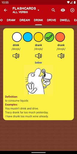 la aplicación "Color verbs pro" Proporciona una lista de 200 verbos irregulares del idioma inglés. Cada verbo contiene ejemplos (por ejemplo, definiciones, oraciones, imágenes, pronunciación de audio y transcripciones fonéticas). Existe la posibilidad de resaltar los verbos que usted considera más difícil, lo que significa que puede identificarlos fácilmente más adelante.