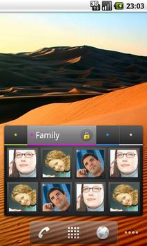 The widget has 3 tabs for "Friends", "Family" and "Work" contacts. Each tab proposes 8 contacts in portrait mode, and 5 contacts in landscape mode. Just tap the photo of a contact to send a call, a message, an email (and more...) !