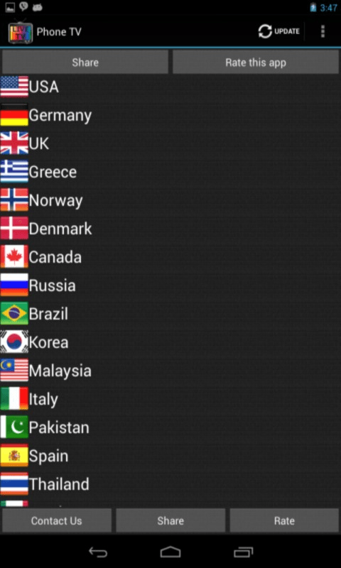 "Phone TV" is simply the best app to watch free live TV on your android device.We offer 1000 working channels from 40 countries and we add more regularly. Enjoy your favorite movies, sports, cartoons and news right on your phone or tablet. No flash is required, just click and enjoy. We strongly recommend using WiFi or unlimited internet with good connection. The app is free but ads supported , a paid version without advertising will be released if we get enough of you to contact us and request one. Please do not post 1 star review if your channel is not working - due to streaming and geographic location not all channels will work at all times. Contact us first and we will do our best to fix it! DISCLAIMER: We do not own,host or stream any content. All the channels are freely available on the internet, this app makes it more convenient for you to watch live television on your phone. All the logos and trademarks belong to their respected owners. If you are the owner of a channels and do not want it in our app - please emails us .We will be more then happy to comply with any DMCA request in less then 24 hours. In order to give you a free app and keep developing more free apps in the future, we are integrating a search tool to our application. This will add a few access points to your device (hence the permissions) to direct you to the web search service. Please consider using the search to help us keep creating apps. You may delete the search icon, bookmark, and homepage easily ( just drag to the trash bin ) . Thank you. You may get notifications in your notifications try or home screen - you can easily opt-out at airpush.com/optout