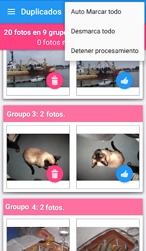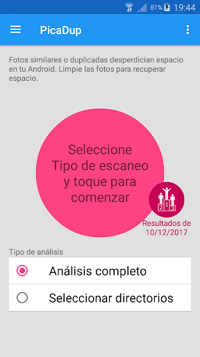 Seleccione uno o más directorios en su dispositivo móvil y PicaDup buscará todas las imágenes con las mismas vistas o temas. Una vez que se completa el análisis, es posible eliminar imágenes en cada grupo encontrado.