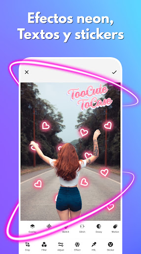 - Herramienta neón para crear divertidos efectos con luces neón, círculos, destellos, líneas y muchos otros efectos de luces neón podrás utilizar para darle vida a tus fotos.