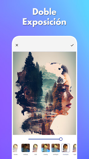 - Con la herramienta de doble exposición podrás crear asombrosas imágenes utilizando 2 fotografías, logrando resultados profesionales y divertidos.