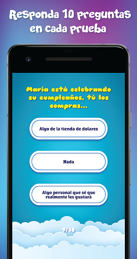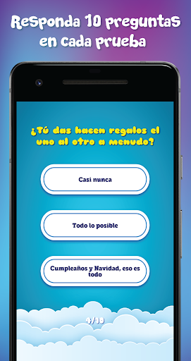 Hay un total de 5 pruebas de amistad diferentes para probar, cada una con 10 preguntas sobre usted y su amigo, haciendo preguntas como: ¿Confía en su amigo? ¿Conocen todos tus secretos? ¿Qué harías si escucharas chismes sobre tu amigo? Y muchos mas...