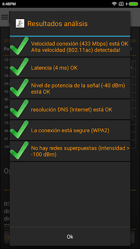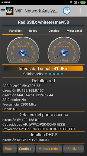 * Información detallada sobre la red y el punto de acceso como el proveedor AP o la frecuencia exacta e información DHCP.