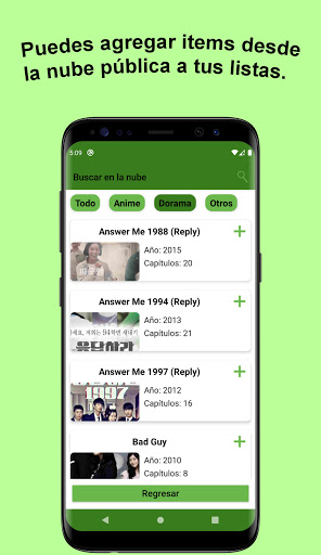 - Crear Listas: Puedes crear tus propias listas de animes, doramas, series, entre otros. Además puedes compartir tus listas con tus amigos y se les actualizarán automaticamente al agregar nuevos items.