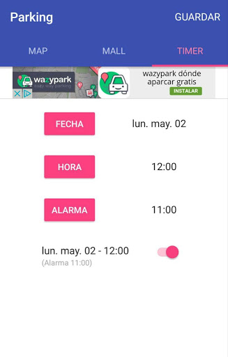 TIMER: Permite añadir una fecha, una hora y una alarma, con tal de recordar al usuario la hora del parquímetro, guardando los datos pulsando en SAVE en la barra superior.