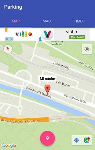 MAP: Muestra un mapa que permite añadir una marca en la posición actual, pulsando en el icono de la chincheta en la parte inferior de la pantalla, con tal de recordar al usuario donde ha aparcado. También, pulsando en dicha marca, y seguidamente en el icono de la flecha azul de la parte inferior derecha del mapa, permite la opción de mostrar un recorrido desde la posición actual hasta la marca