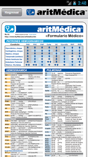 La aritMédica™ App incluye medicinas, dosis, fórmulas, ecuaciones y valores normales para una serie de parámetros hemodinámicos, pulmonares, renales, de nutrición, etc.