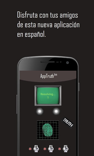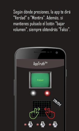 Apptruth es un detector de mentiras. La aplicación detectará si es verdad o no lo que preguntas. Bueno, realmente no. Serás tú, quien con la posición de tu dedo cambie la respuesta. Si pulsas un poco más a la izquierda, la app contestará "Verdad", y si pulsas un poco más a la derecha, la app contestará "Falso". Si algún amigo se extraña y sospecha, pulsa el botón de "bajar volumen" mientras él pulsa y siempre saldrá de resultado "Falso". Observa las capturas de Play Store para obtener ayuda.