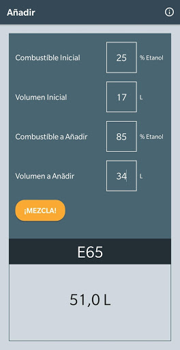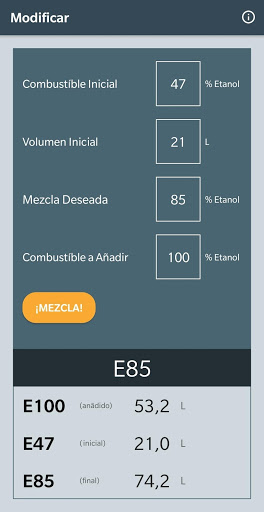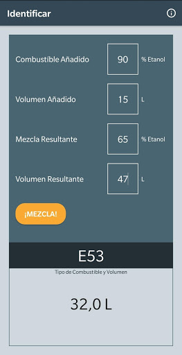 Determina la cantidad de combustible necesaria para obtener una mezcla deseada. Útil cuando hay combustible conocido (tipo y volumen) en el tanque y se necesita una mezcla específica de etanol-gasolina.