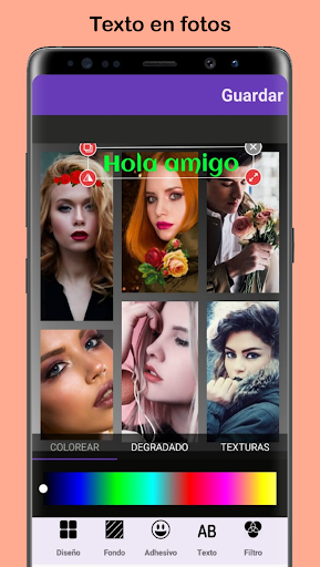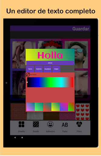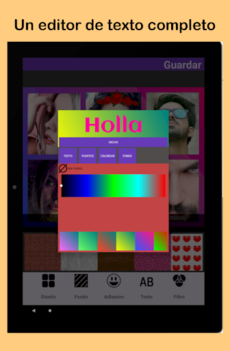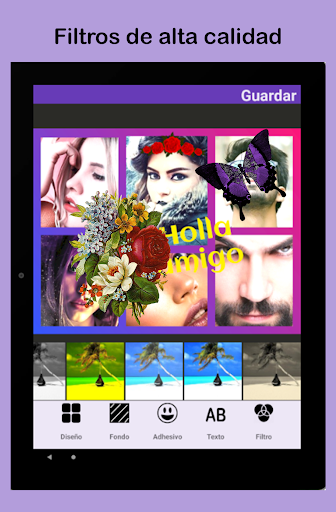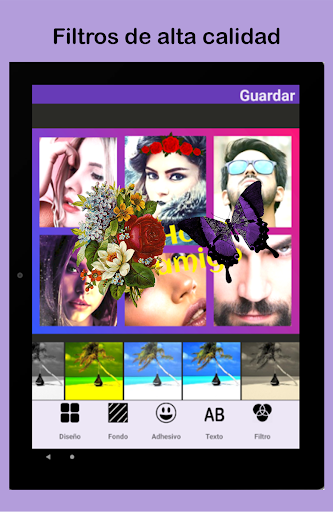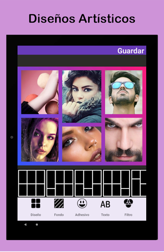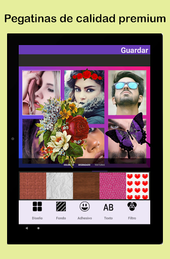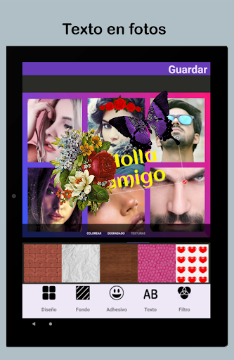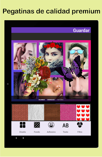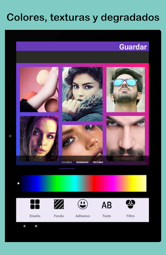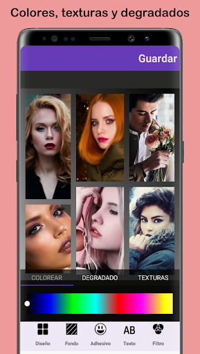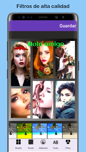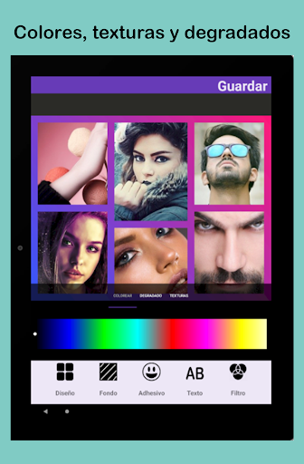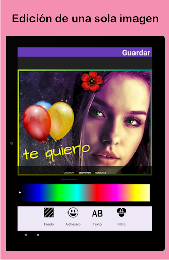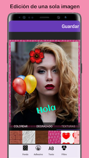 de fondo,texturas y degradados y todos los filtros. La aplicación también tiene la función de editar una sola imagen