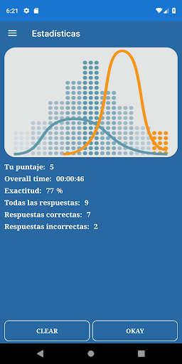 Puede ver las estadísticas eligiendo el elemento del menú en el Menú principal. La información incluye el puntaje general, precisión, conteo de respuestas correctas e incorrectas.