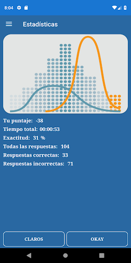 Puede ver las estadísticas eligiendo el elemento del menú en el Menú principal. La información incluye la puntuación general, el tiempo general, la precisión, el recuento de respuestas correctas e incorrectas.