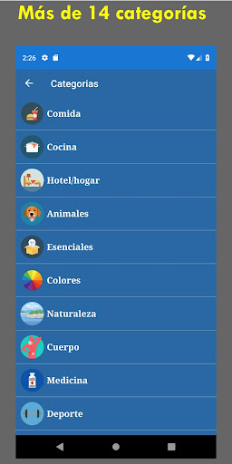 Además, esta es una buena aplicación para aprender nuevas palabras en inglés. Puede ver imágenes vinculadas a palabras, escuchar la pronunciación y memorizarlas. Puede activar una combinación de idiomas para aprender inglés u otros. Entonces verá las palabras originales y traducidas.