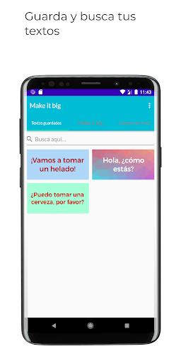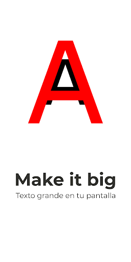 Make it big - Texto grande en tu pantalla es una gran aplicación gratuita para comunicarse con otras personas en momentos en los que no es posible expresarse hablando. Con Make it big - Texto grande en tu pantalla puedes mostrar un texto grande en tu smartphone que se redimensionará automáticamente en función de la cantidad de texto grande que se introduzca. Make it big - Texto grande en tu pantalla se desarrolló específicamente para mostrar a las personas con dificultades para oír lo que dice el usuario. Ya sea desde el otro lado de la habitación o uno al lado del otro, el texto grande o grande de la pantalla puede ayudar a mostrar lo que tienes que decir.