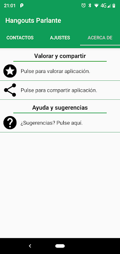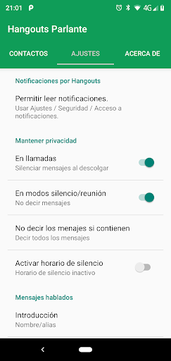• Configuración para decir el nombre del grupo, la duración de los mensajes multimedia de hangout messenger, emoticonos, pegatinas o emojis.