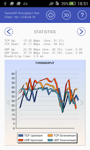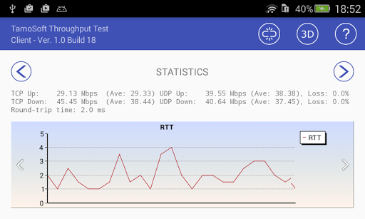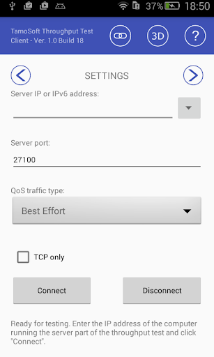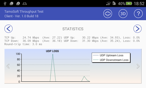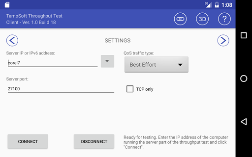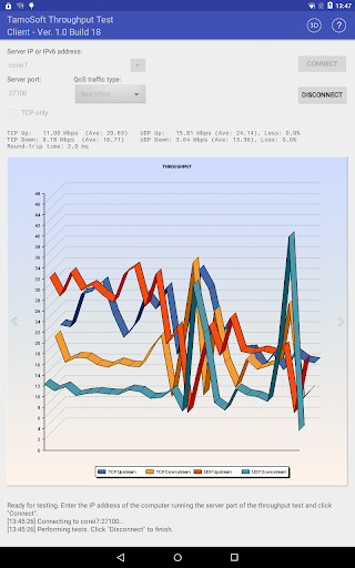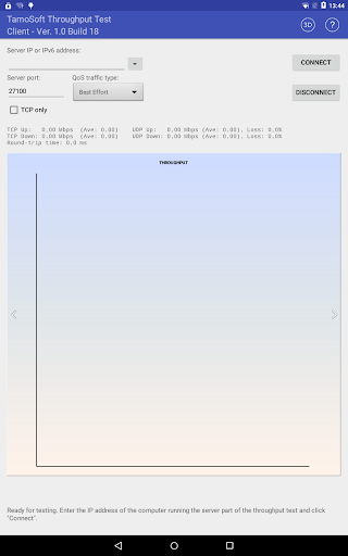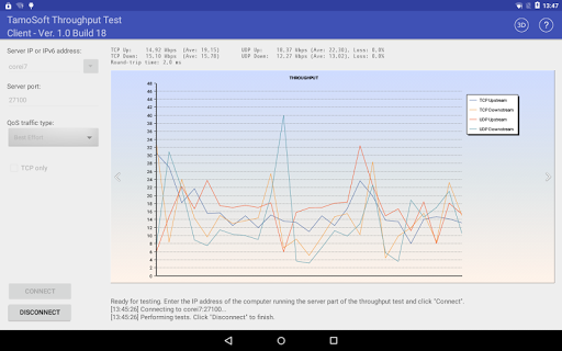 Install the server part on the wired side of your network, and then use this client part running on your Android device to measure performance. Enter the IPv4 or IPv6 address of the server and click Connect. The client will attempt to connect to the server, and if the connection is successful, continuous throughput testing will commence. Swipe the chart to see TCP and UDP throughput, UDP loss, and round-trip time. Full documentation is available