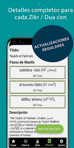 (تسبیحةالزھراء / تسبیح فاطمہ الزھرا). Para cada paso (tesbihat) en un wazifa (secuencia de tesbihat), muestra el texto para recitar y las repeticiones para hacer que las secuencias complejas de zikir sean simples.