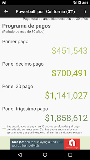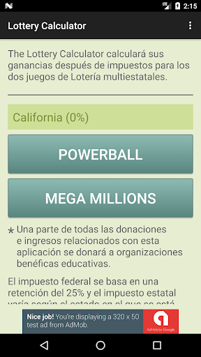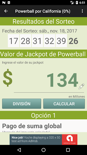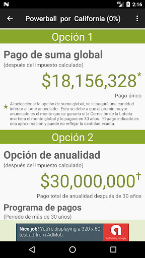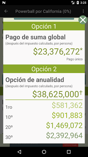Calcula la suma global y la anualidad (30 pagos) para las dos loterías multiestatales de los Estados Unidos, Powerball y Mega Millions. La cantidad provista es posterior a las retenciones fiscales federales y estatales. Esto le da una idea realista de cuáles serían sus pagos si / cuando gana la lotería.