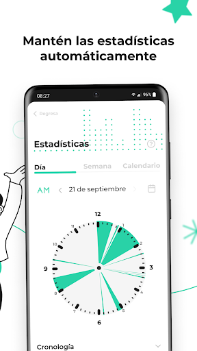 - Visualización de estadísticas con gráficos interactivos y modo de reloj digital