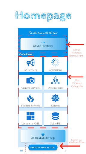 Esta aplicación también contiene conceptos de estudio de Android y accesos directos para que la codificación sea fácil y requiera menos tiempo.