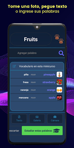 Rápidamente, cargue una lista de palabras tomando una imagen, pegando el texto o ingresando palabras manualmente y se preparará una lección de vocabulario personalizada para usted de inmediato.