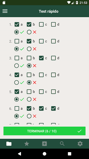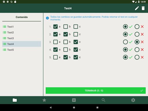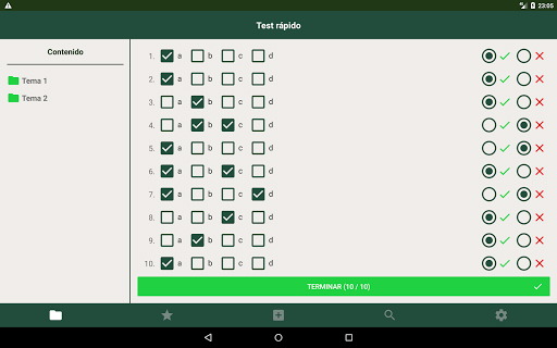 Completa test sin la necesidad de utilizar papel ni bolígrafo. Solo tienes que seleccionar el número de preguntas y el número de respuestas por pregunta, y se creará un nuevo formulario en el que podrás contestar cada pregunta con un simple click. Al final, podrás validar tus respuestas y guardar los resultados.