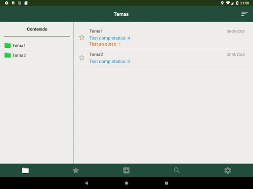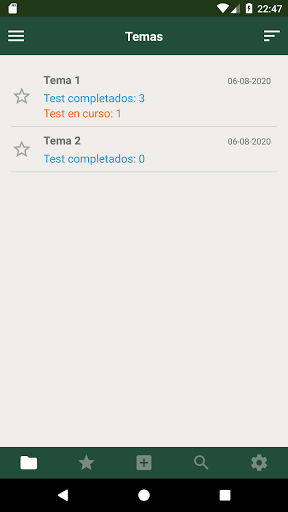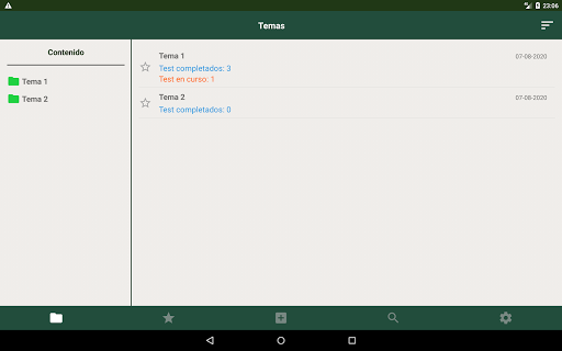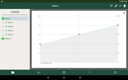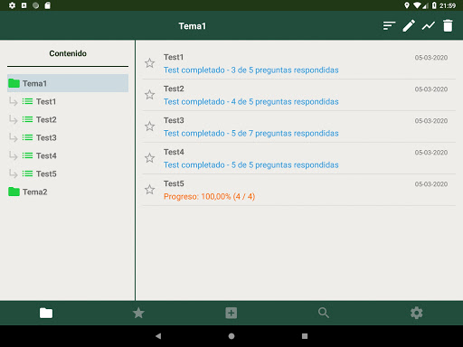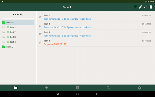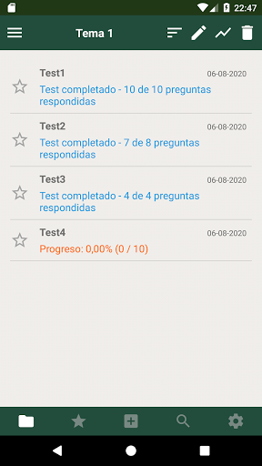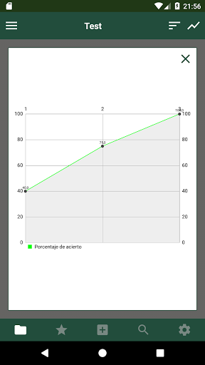 A medida que completes test, la aplicación te permite guardar los resultados, estructurarlos en carpetas y comprobar tu progreso utilizando una serie de gráficos de evolución.