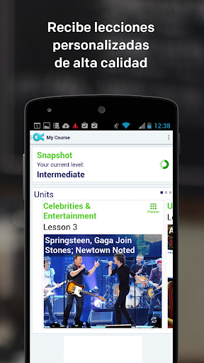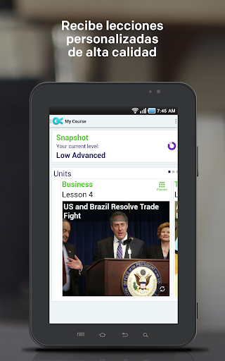 En lugar de enseñar frases que no son relevantes para las necesidades de nuestros estudiantes como "Janie kicks the ball", ofrecemos contenido en inglés que se actualiza todos los días. Los estudiantes de Voxy estudian en contextos relevantes con videos de personas haciendo rutinas diarias, audio con conversaciones de situaciones de la vida real, lecciones basadas en su música favorita y las noticias del día de medios principales como The Associated Press.