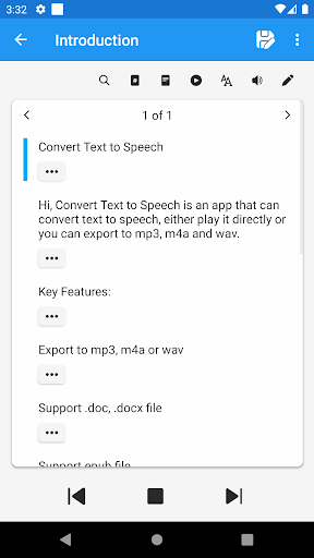 Convert Text to Speech is an app to convert text to speech, also can be exported as audio, most documents are supported such as pdf, epub, docx, and websites for your daily news.
