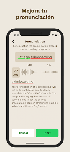 Recibe opiniones inmediatas y personalizadas del IA después de cada respuesta. Entiende tus fallos, aprende el uso correcto y mejora tu pronunciación y fluidez rapidito.