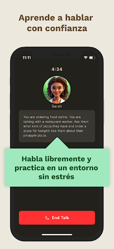 Zaplingo Talk te ofrece llamadas sobre un montón de temas guays, cotidianos y divertidos. Desde pedir comida en un restaurante, charlar sobre planes de viaje, debatir sobre pelis o simplemente darle a la cháchara – Zaplingo Talk te prepara para conversaciones reales, adaptándose siempre a tu nivel y ritmo. Nuestros tutores IA simulan conversaciones naturales, permitiéndote experimentar las diferencias de acentos y dialectos.