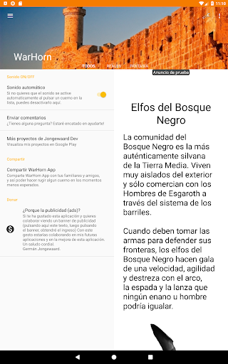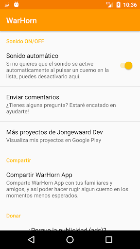 • COLABORA CON EL DESARROLLADOR: WarHorn ofrece la posibilidad al usuario de pulsar sobre los botones que se llaman DONAR, de este modo el desarrollador no invade la aplicación con publicidad constantemente. Envía feedback al desarrollador por las redes sociales mencionadas al pie de este texto.