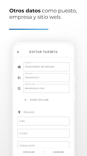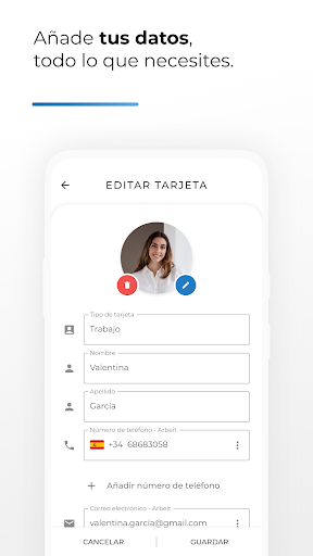 • Incluye toda la información que desees en tu tarjeta de visita, como tu nombre, datos de contacto, sitio web, dirección, información de la empresa, perfiles en redes sociales y más.