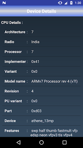 CPU Detalles: Información relacionada con CPU Su teléfono o tableta, se ha presentado por este componente de la aplicación, información de CPU como revisión de CPU, variante de CPU, serie de CPU, modelo de CPU, usos de RAM, ABI, variante de CPU, Serial, Implementador de CPU, puerto de CPU, revisión de CPU, modelo de hardware, etc.