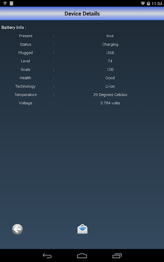 Detalles de la batería: Todos los detalles relacionados con la batería importante de su teléfono o tableta se muestra al usuario, por lo que si hay alguna discrepancia con la batería, O su batería no se está realizando según las expectativas, luego use este módulo, puede obtener información de la batería, sin quitar la batería de su teléfono. Tipo de batería, salud de la batería, nivel de batería, fuente de alimentación, voltaje, temperatura, estado.