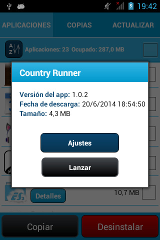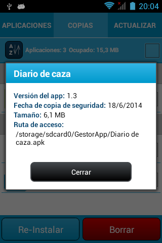 Para ayudarte a gestionar tus aplicaciones, GestorApp permite crear copias de seguridad. Estas copias serán guardadas en la memoria externa y estarán disponibles en el panel de "COPIAS". En dicho panel aparecerán listadas las copias o backup que hayas realizado con GestorApp, para permitirte gestionarlas a tu gusto.